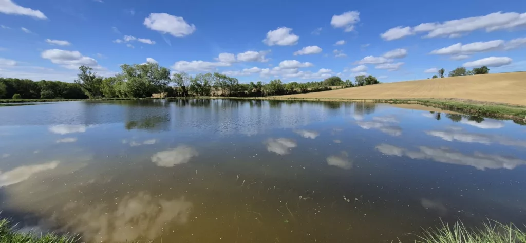 Passage prés d’un lac collinaire d’irrigation, salué par quelques coups de canon destinés à effaroucher les oiseaux dans ces champs fraichement semés de mais ou de tournesol.