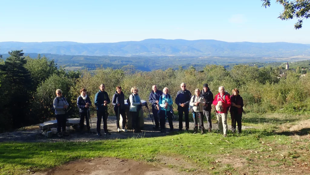 Nous empruntons un chemin forestier qui nous mène à une table d’orientation avec un point de vue sur la montagne noire et au loin nous distinguons les Pyrénées.
